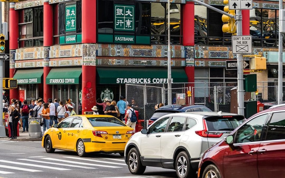 New York / USA – August 04 2019: Starbucks coffee and Eastbank in Chinatown