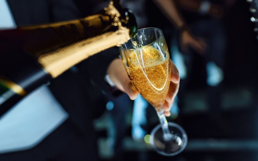 On a dark background of party hand pours a gold drink with bubbles from a bottle of sparkling wine.